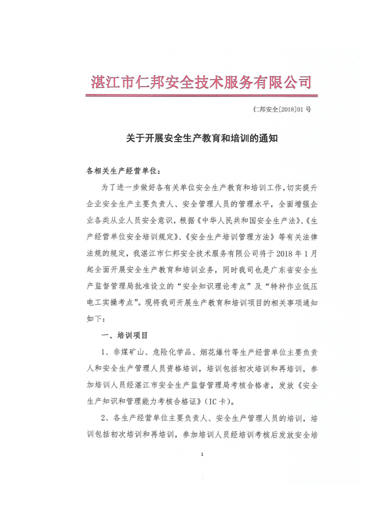 關(guān)于開展生產(chǎn)培訓(xùn)的通知(仁邦安全技術(shù)公司)