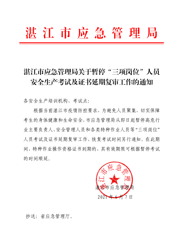 湛江市應(yīng)急管理局關(guān)于暫?!叭?xiàng)崗位”人員安全生產(chǎn)考試及證書(shū)延期復(fù)審工作的通知